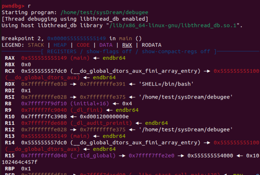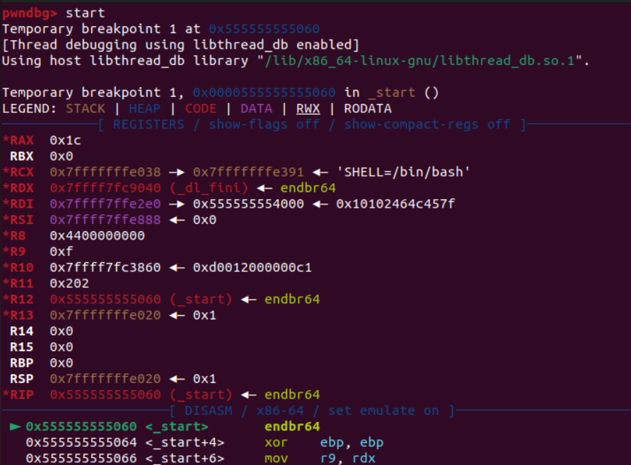 gdb debugee로 들어가 pwndbg에 start 명령을 입력하면