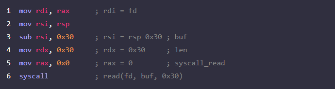 rsi는 파일에서 읽은 데이터를 저장할 주소를 가리킨다. 0x30만큼 읽을 것이므로, rsi에 rsp-0x30을 대입한다.
