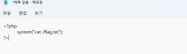파일 업로드 취약점을 통해서 플래그를 찾아볼 것이므로 메모장에 flag.txt의 내용을 확인하는 코드를 작성한 후