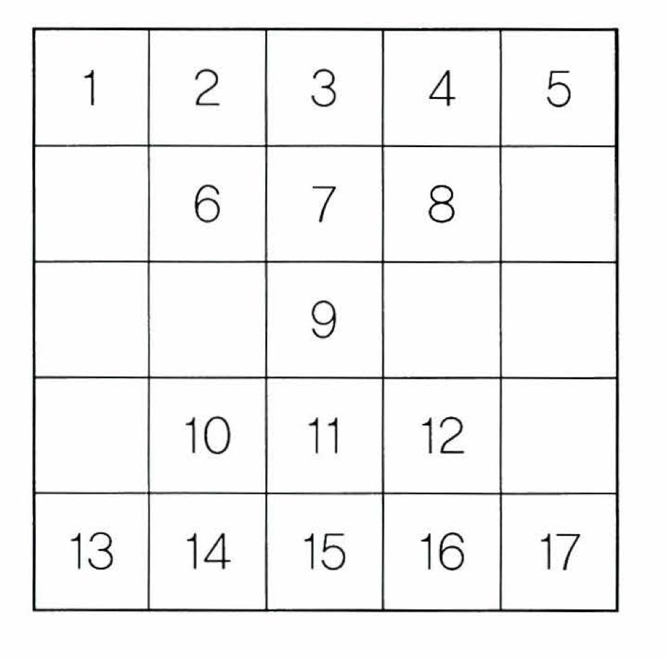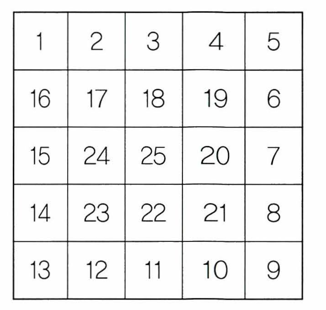 2차원 배열 A(5,5)의 원소에 1부터 25까지의 번호를 다음 그림과 같은 모습으로 저장해주는 알고리즘 순서도