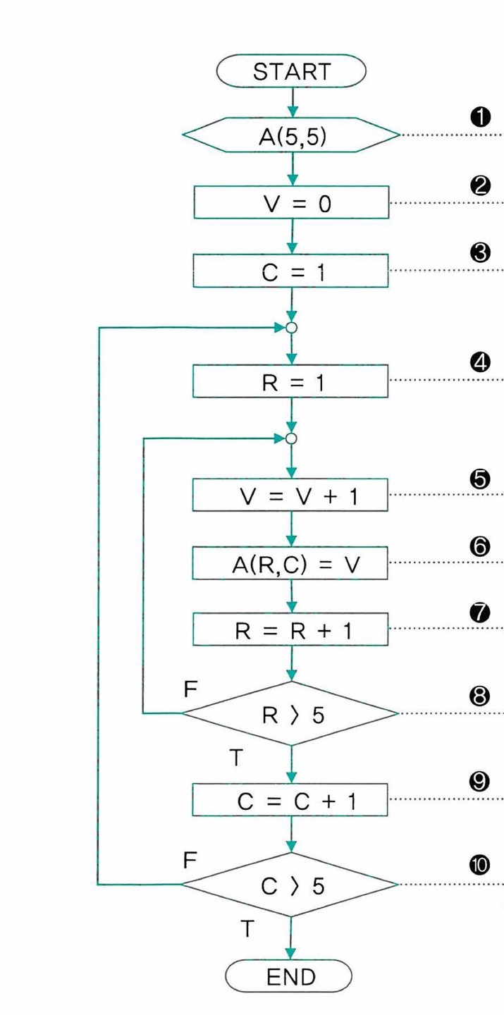 - 1행 1열부터 값을 채운 뒤 A(R,C)에 V값을 저장하고, R과 V의 값을 1씩 증가시켜 저장하는 것을 R(행)이 다섯번째 행이 될 때까지 반복한다.