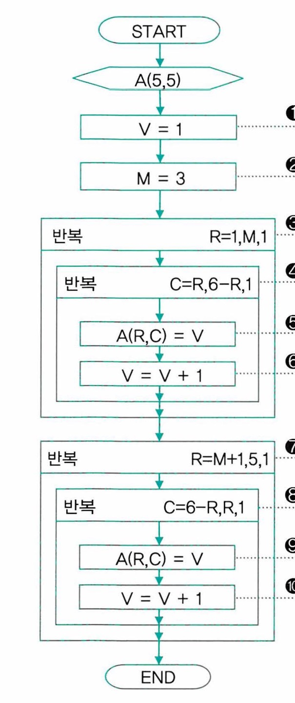 2차원 배열 A(5,5)의 원소에 다음과 같은 모습으로 값을 저장해주는 알고리즘 순서도