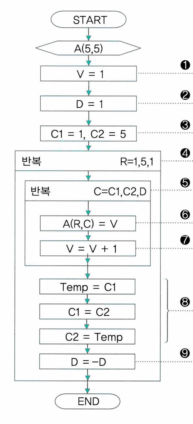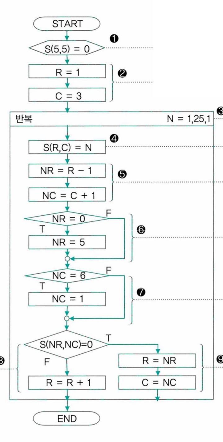- R행 C열에 자연수 N을 할당하고 행은 1 감소, 열은 1 증가시킨다. 감소시킨 행이 0이면 5행으로 재설정하고, 증가시킨 열이 6이면 1열로 재설정한다.