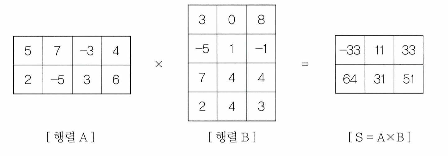 - S(R,C) = 0으로 초기화하고, 행렬 A(R,K)와 B(K,C)의 곱을 누적하는 S(R,C)를 A의 열 수 인 4만큼 반복한다.