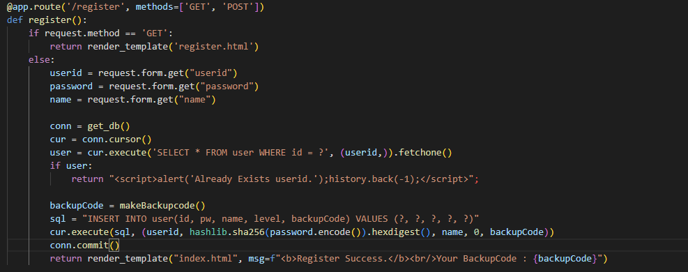 - 사용자가 입력한 userid와 backupCode가 계정 정보와 일치한다면, 비밀번호를 바꾸고, 바꾼 BackupCode를 출력 => sleep(1)을 걸어서 1초 내에 여러 접근이 발생할 경우 레이스 컨디션 취약점이 발생함