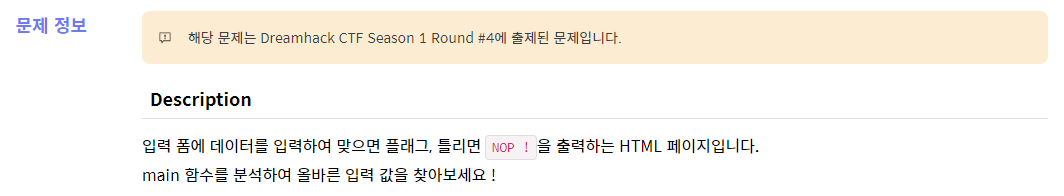 문제) 입력 폼에 데이터를 입력하여 맞으면 플래그, 틀리면 NOP !을 출력하는 HTML 페이지입니다. main 함수를 분석하여 올바른 입력 값을 찾아보세요 ! (해당 문제는 Dreamhack CTF Season 1 Round #4에 출제