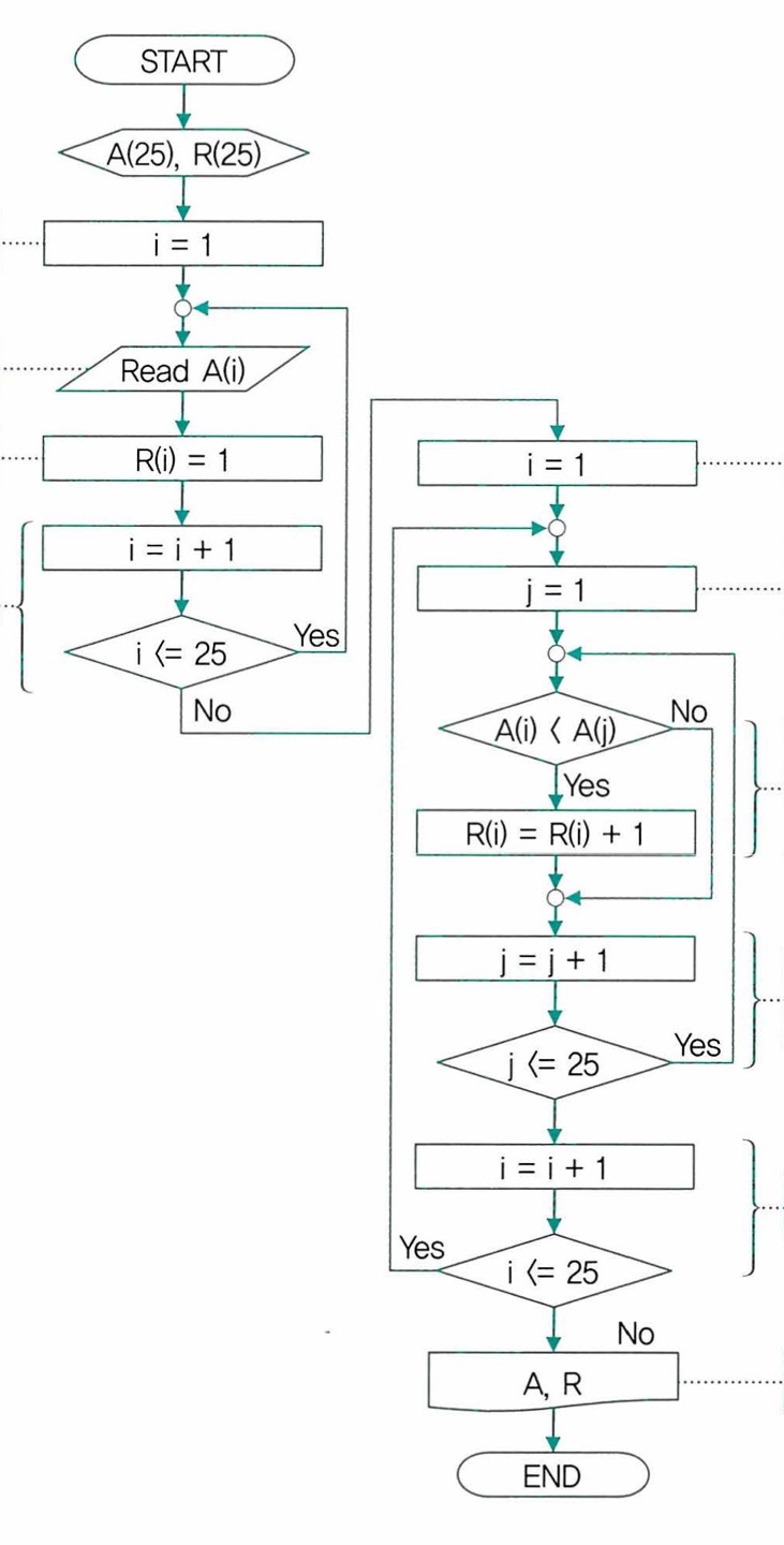 A회사는 25개의 대리점을 가지고 있다. 이들 대리점의 전년도 매출액을 순서대로 읽어 들여 매출액을 토대로 대리점의 석차를 구한 후, 25개의 대리점에 대하여 매출액과 석차를 함께 출력하는 알고리즘을 제시하라. 단, i번째 대리점에 대하여 A(i)는 매출액을 나타내고, R(i)는 석차를 나타낸다. 만일 매출액이 동일한 대리점이 존재할 경우 자신보다 상위자로 보지 않고 석차를 낮추지 않도록 한다.