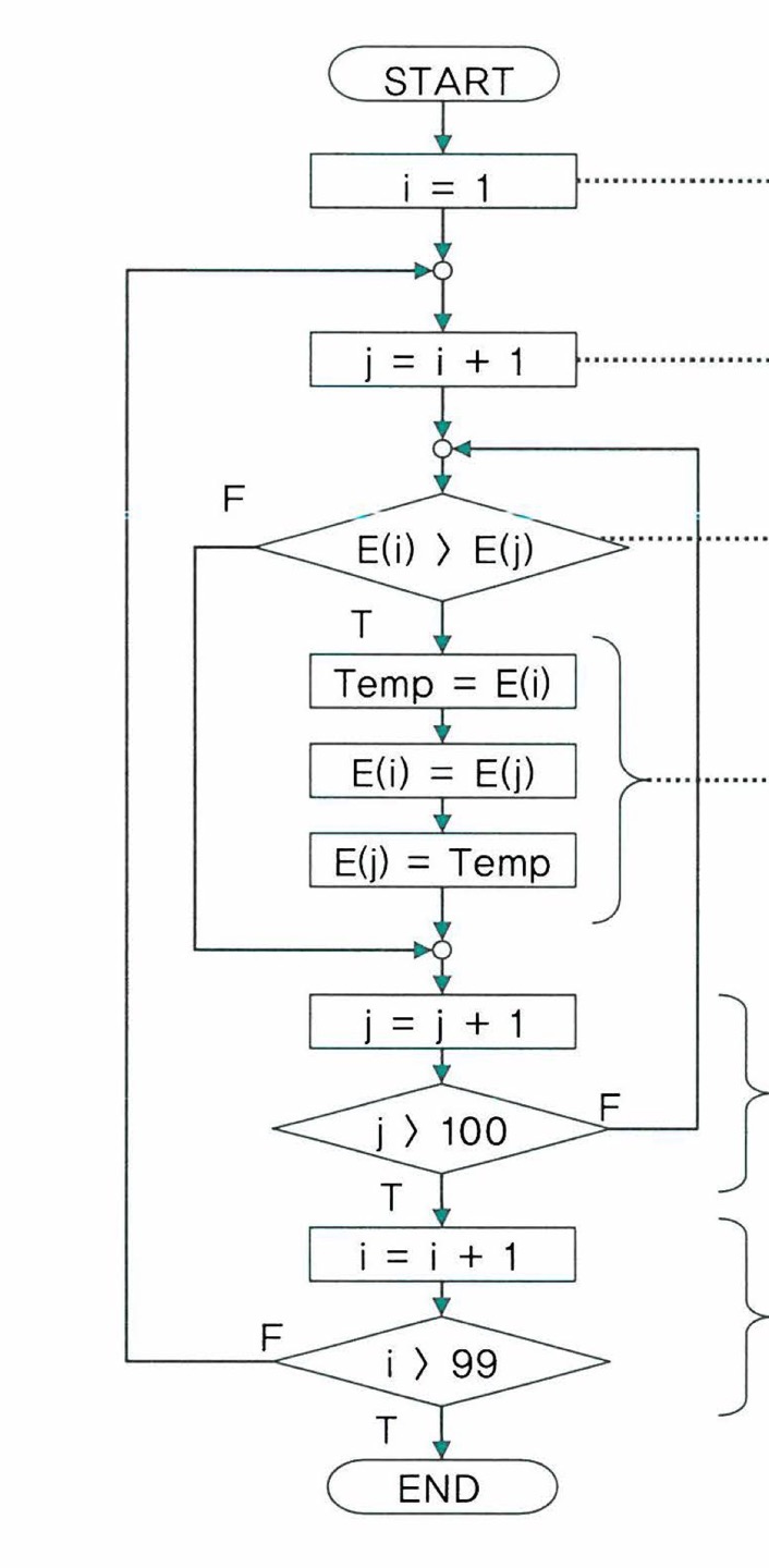 - j를 1 증가시키고, j가 100-i번 반복할 때까지 반복한다. j가 100-i번 반복했다면, i를 1 증가시키고 j를 1로 초기화한 다음 E(j)와 E(j+1)를 비교하여 교환하는 과정을 반복한다.