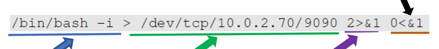 - 셸의 출력 장치(stdout)가 10.0.2.70의 포트 9090으로 TCP 연결로 리디렉션
