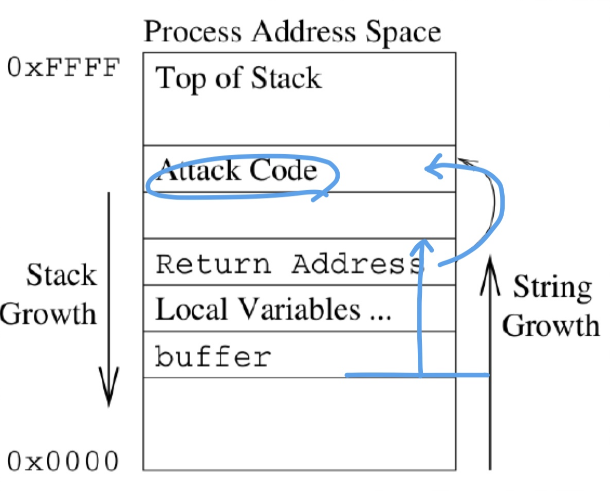 - 운영체제와 하드웨어에서의 Memory protection: 실행할 수 없는 곳에서는 실행이 안되도록 함