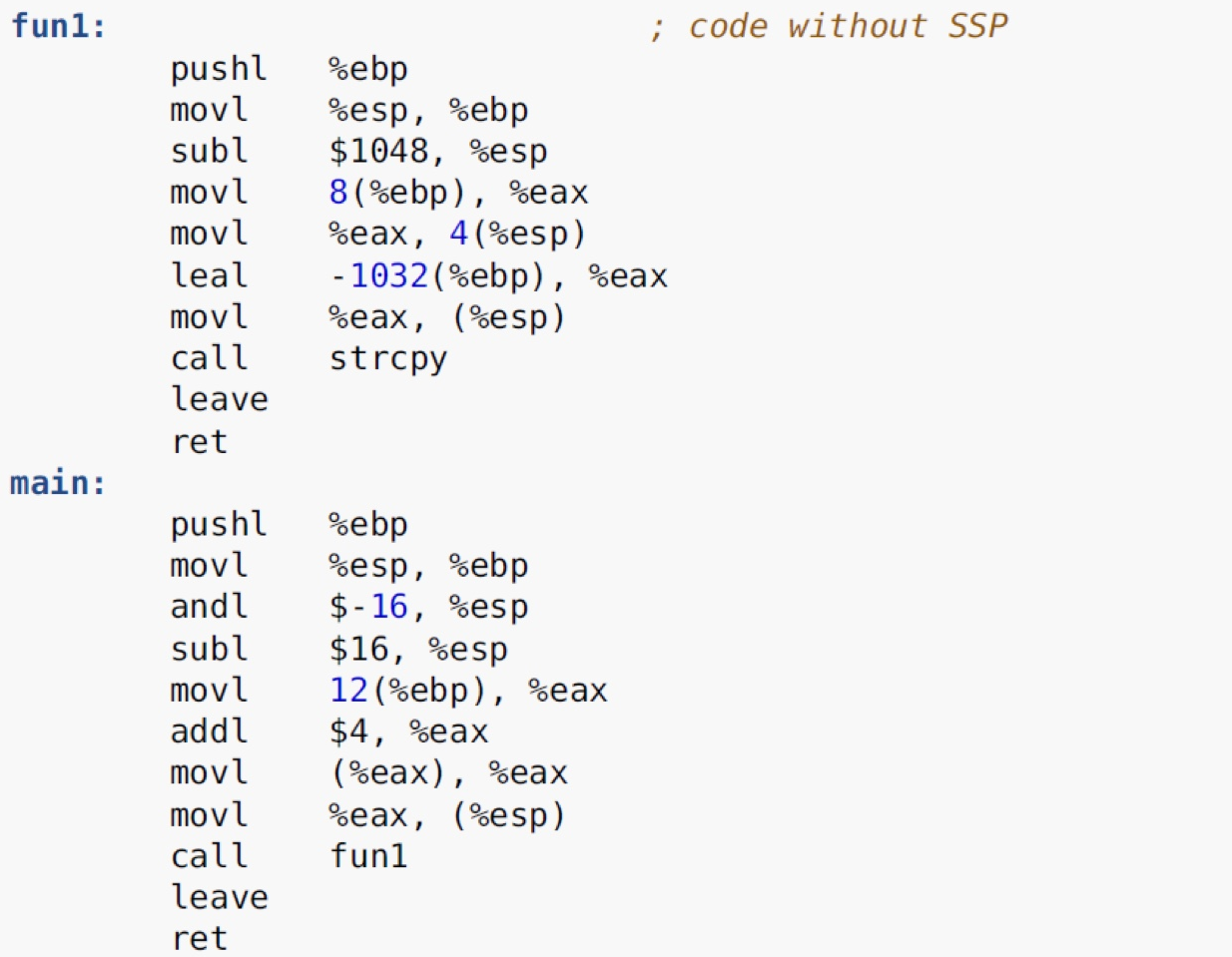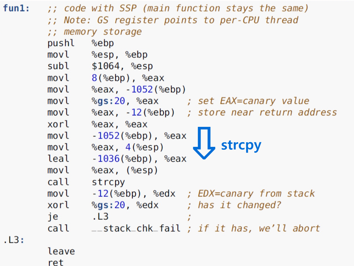- 리턴 주소 근처에 canary 값을 저장한 후, strcpy를 호출한다.